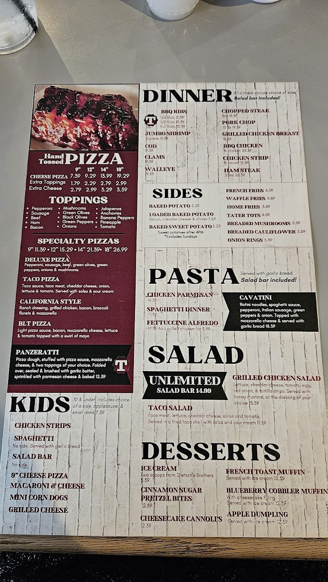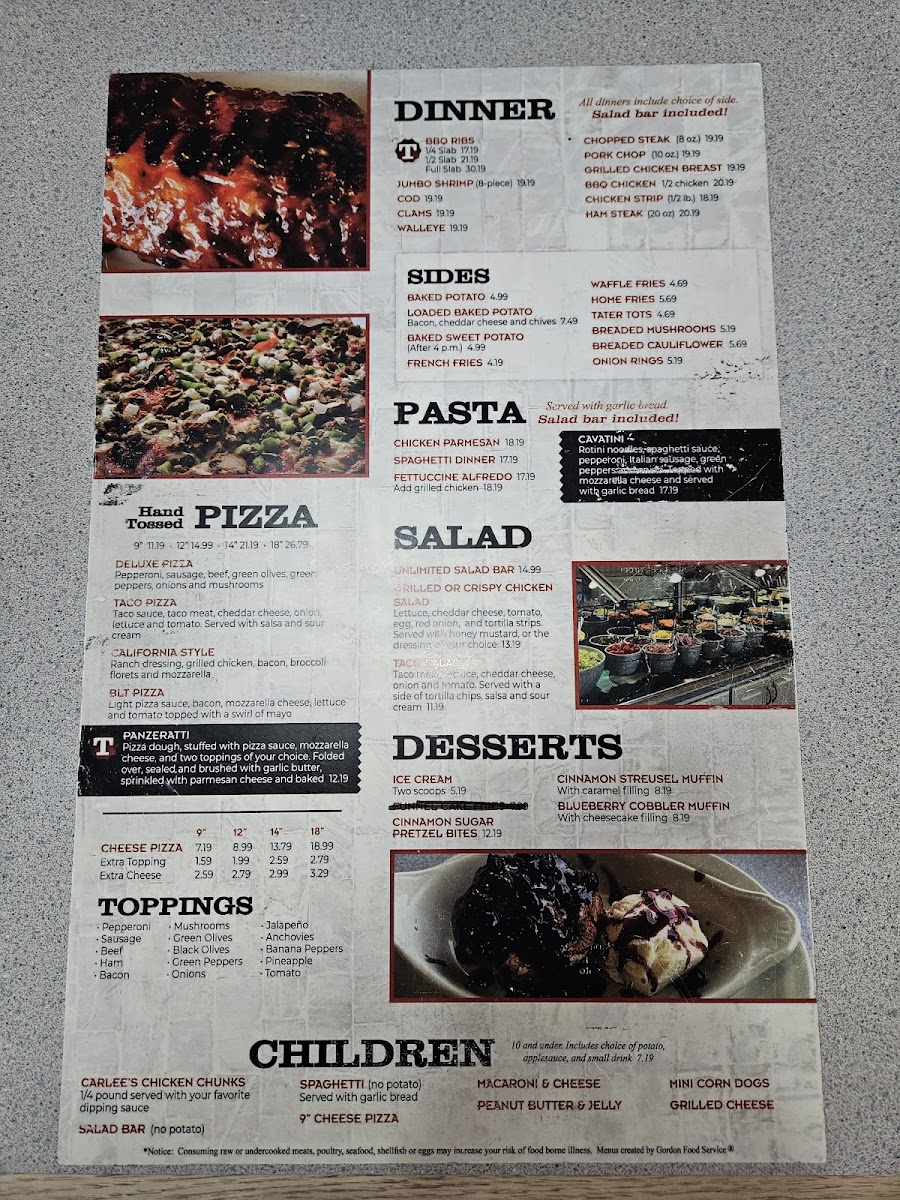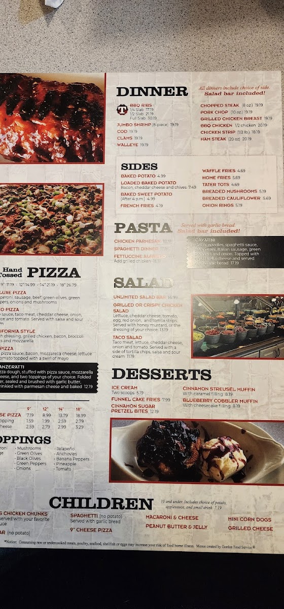 The menu balances casual favorites like burgers, chicken fingers, and sandwiches with more traditional meals including walleye and rib dinners. Many dinner entrées come paired with a well-rounded salad bar, offering a mix of fresh greens, pasta salads, and even sweet dessert fluffs, complementing the main plates in a way that feels welcoming and complete.