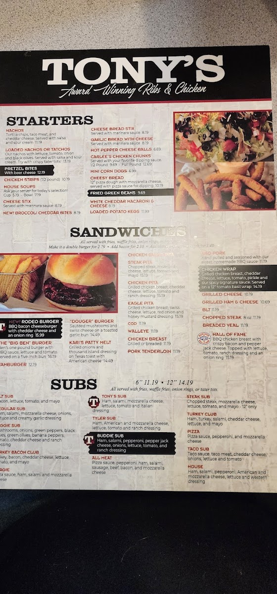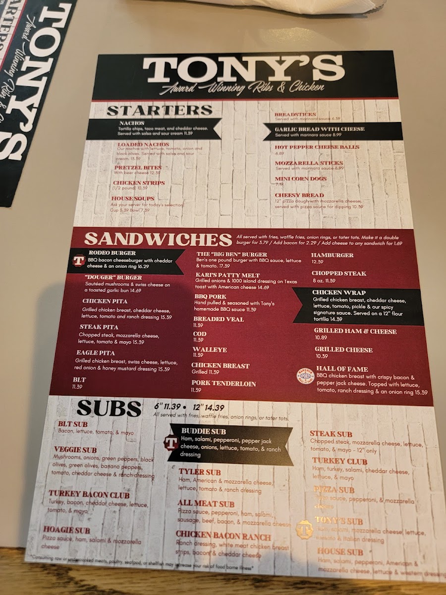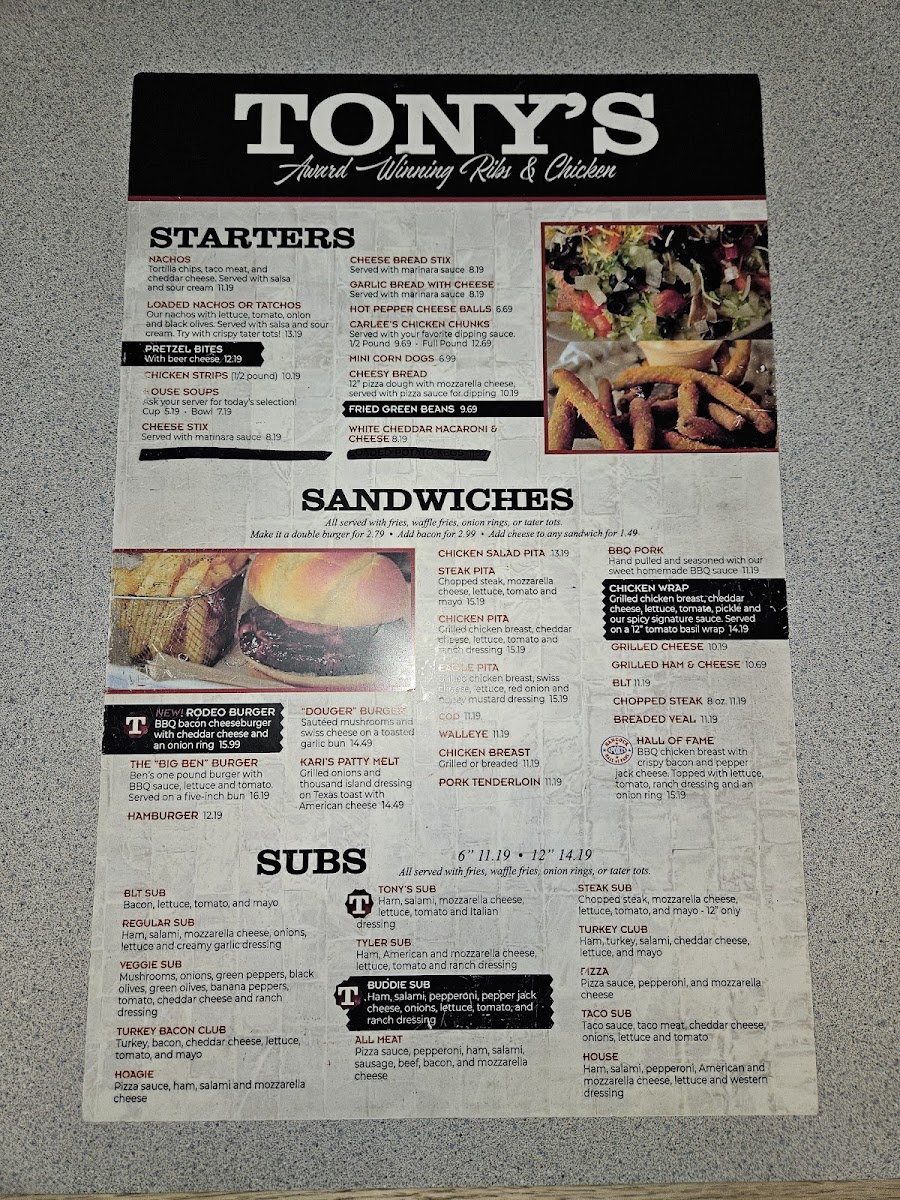 Tony's Restaurant offers a straightforward, comforting menu that feels like a classic family dining experience. The selection leans into hearty, familiar meals that suit gatherings any time of the day—whether it’s a leisurely lunch or a relaxed dinner with loved ones. You'll find a range of satisfying options from tender BBQ ribs served alongside crispy onion rings and fries to comforting dishes like chicken parmesan and home-style pork chop dinners.
